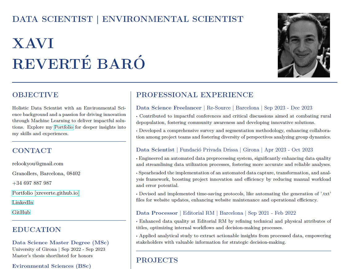 Continuing my journey in professional development, I've designed and created my Curriculum Vitae! This project highlights my comprehensive background as a Data Scientist with a foundation in Environmental Science. The CV meticulously showcases my education, skills, professional experience, and key projects, all formatted with LaTeX to ensure clarity, aesthetic design, ATS compatibility, and professionalism.