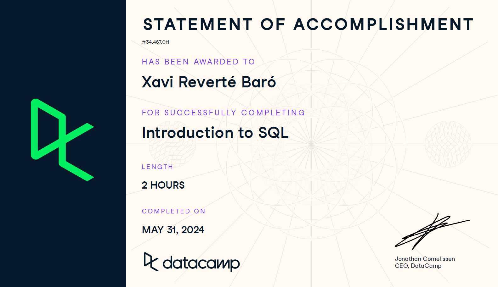 Continuing my lifelong learning journey, I've completed this course! Through this introduction to SQL, I have gained essential skills in manipulating and retrieving data from relational databases. From understanding database organization and best practices to writing SQL queries and exploring SQL variants like PostgreSQL and SQL Server, I've developed a solid foundation in SQL. I'm now equipped to extract and organize data effectively for my projects.