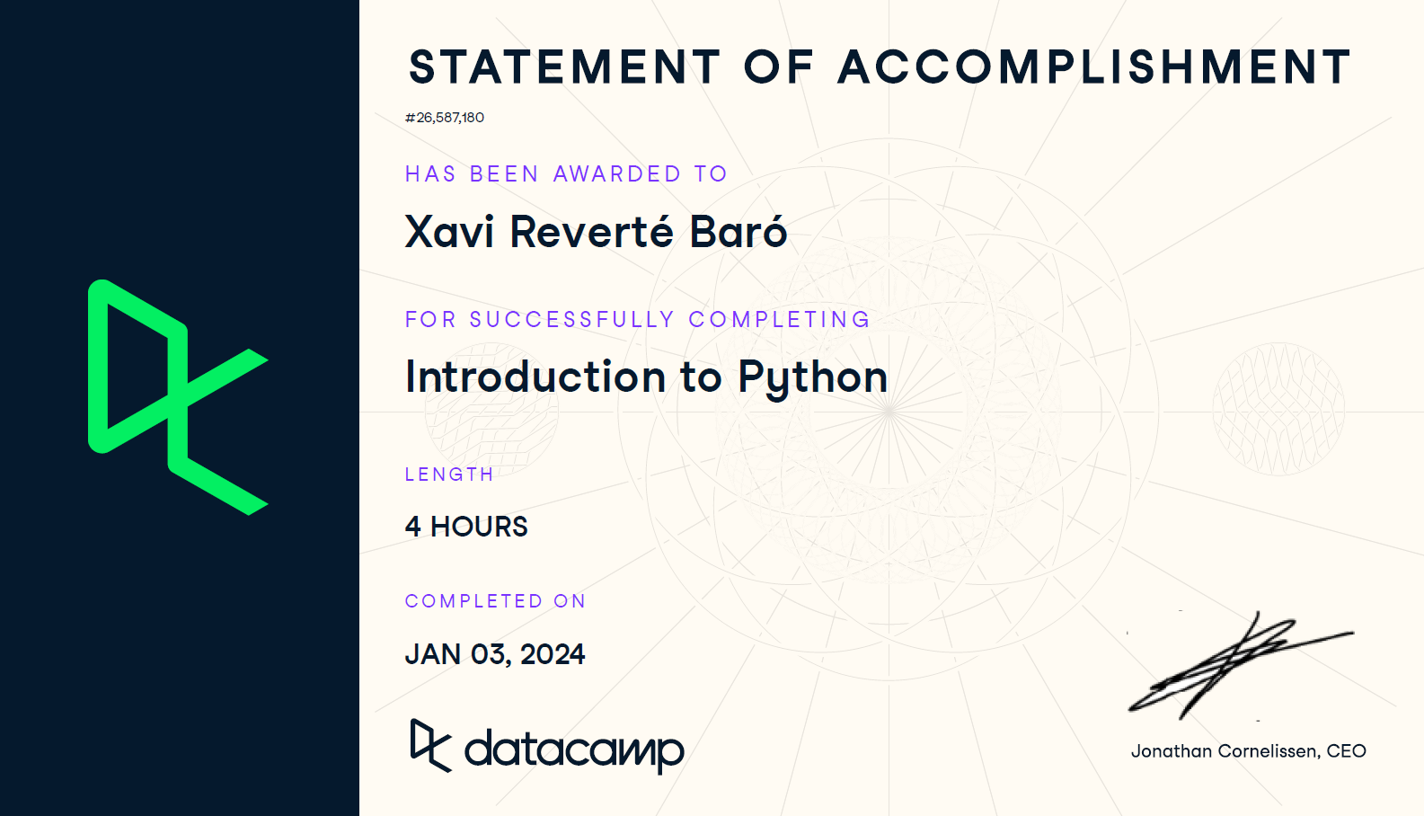 Continuing my lifelong learning journey, I've completed this course! Dive into the Python fundamentals track, where I've gained essential skills to kickstart my journey as a Python programmer. From cleaning real-world data to crafting custom functions, I've learned to manipulate and visualize data using NumPy, Matplotlib, and pandas. Join me in mastering these foundational Python skills and unlocking new opportunities in the world of data science..