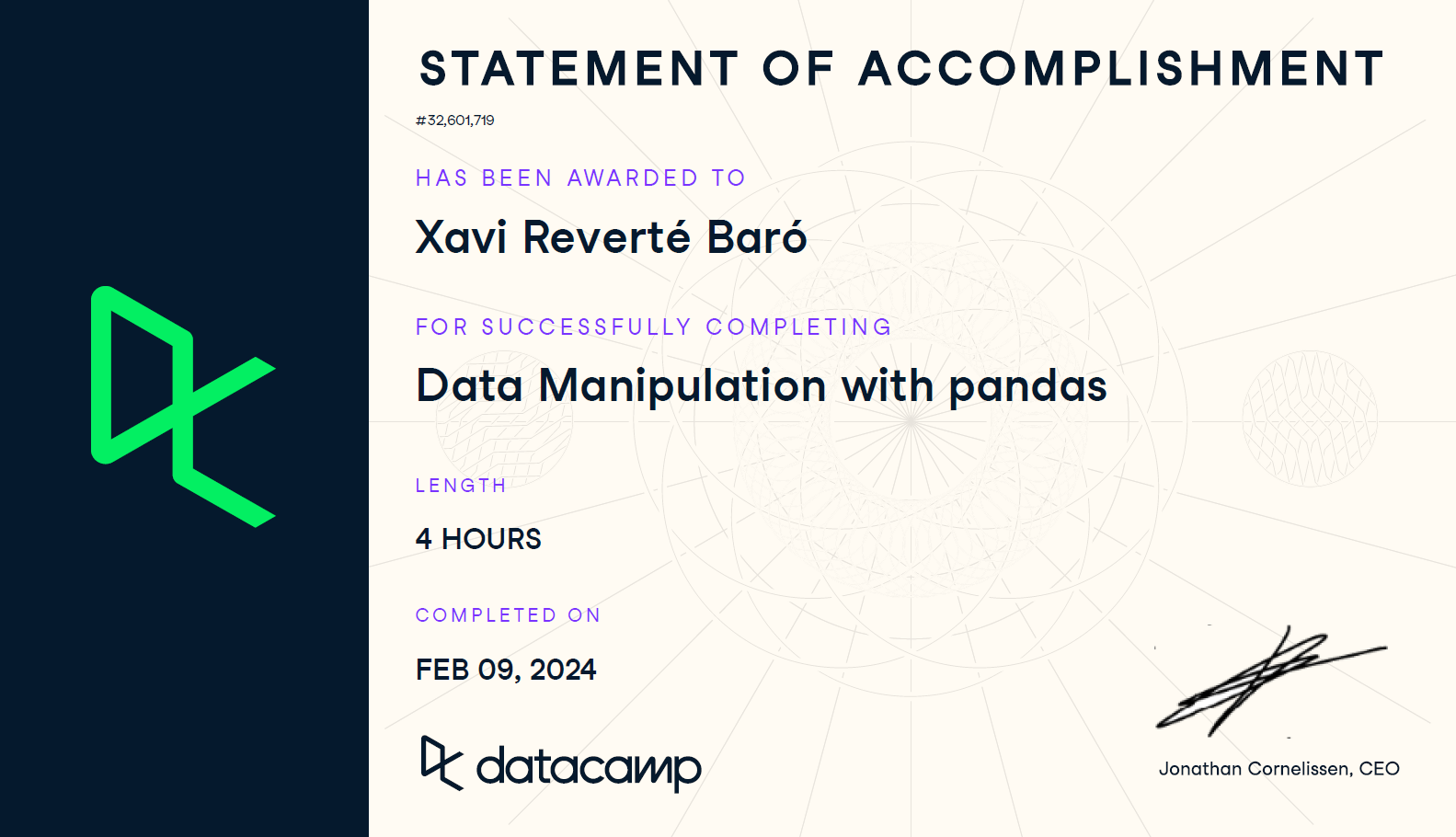 Statement of Accomplishment: Data Manipulation With Pandas | Coursework