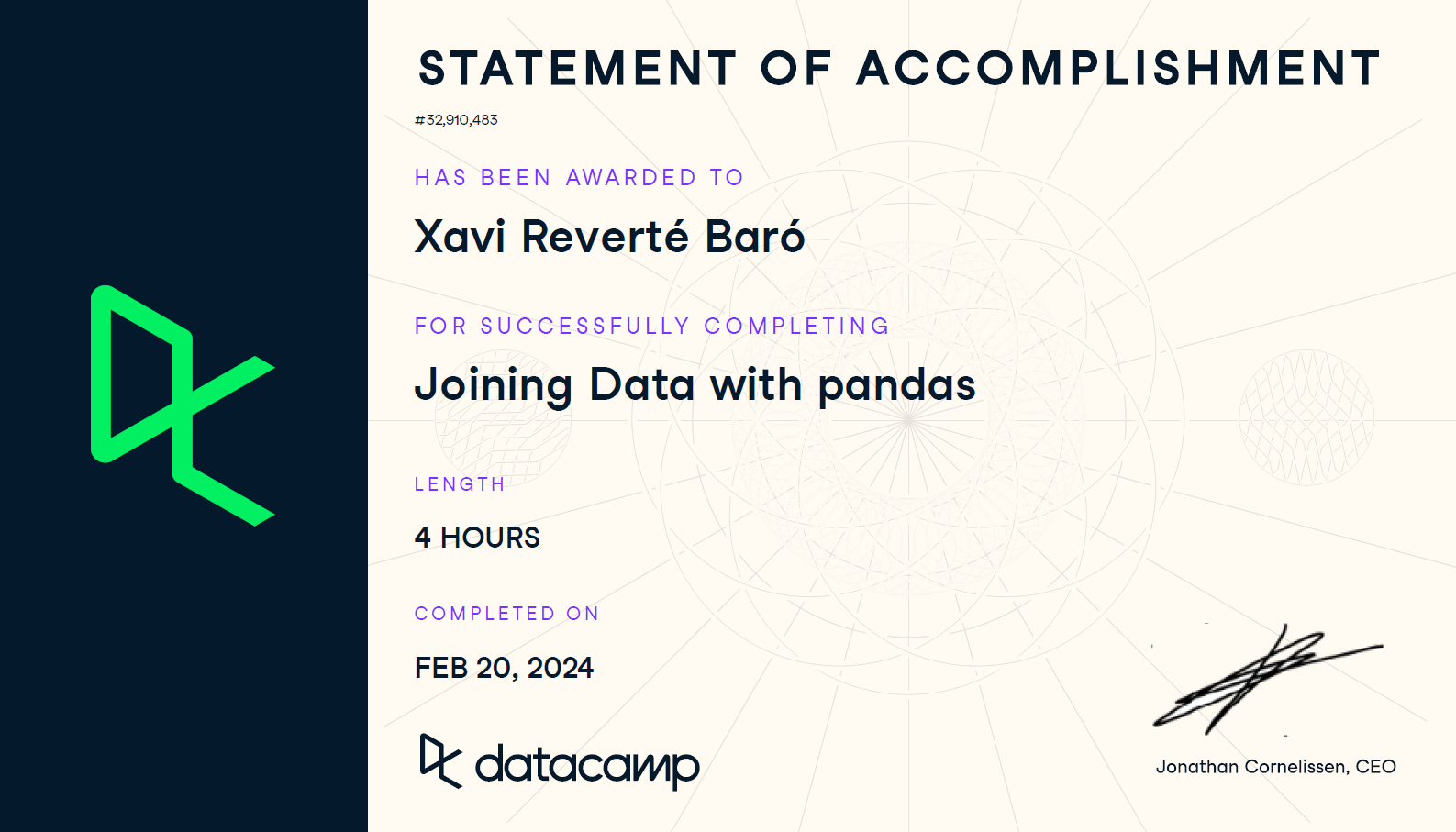 Continuing my lifelong learning journey, I've completed this course! Explore the fundamentals of joining and manipulating data with pandas, a vital skill for any data scientist. From basic inner joins to advanced merging techniques, I've gained proficiency in combining, organizing, and reshaping multiple datasets. Through practical exercises with real-world datasets, I've acquired the skills needed to uncover valuable insights hidden within disparate data sources.