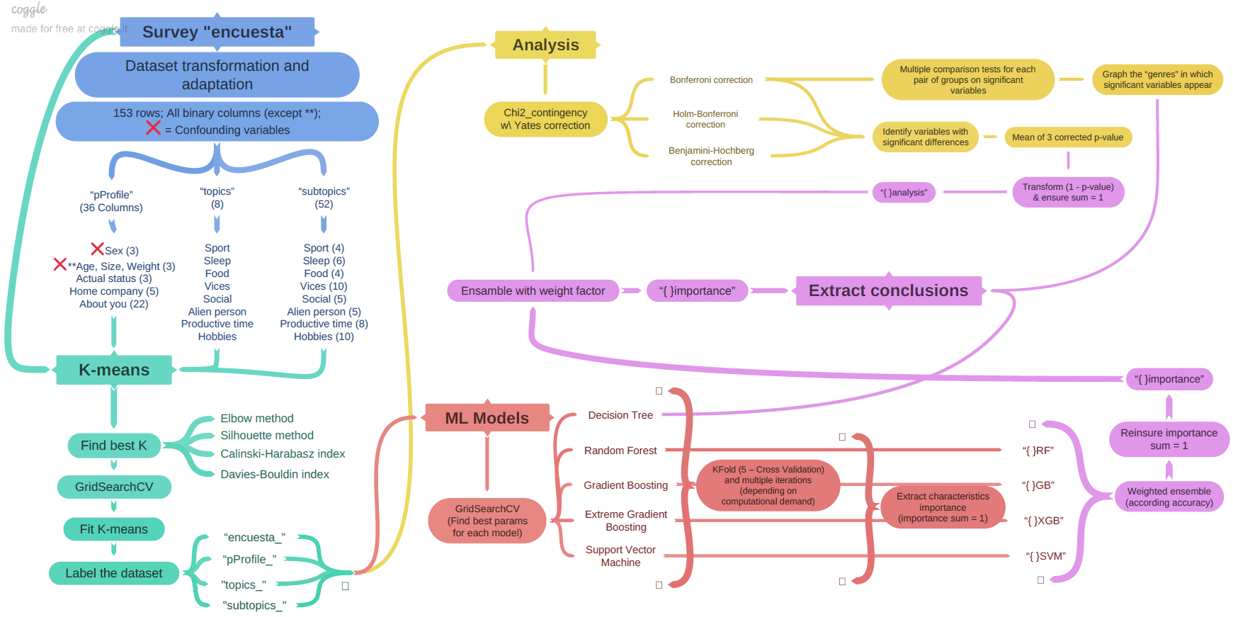 This visualization depicts the workflow of a study conducted as part of the 'Influence Factors Analysis on Personal Happiness' project. Processes related to dataset transformations and adjustments are represented in blue, while those associated with data clustering are shown in green. Yellow nodes represent descriptive analysis for group characterization, red nodes signify machine learning classifier models indicating the importance of variables in group characterization, and purple nodes denote the final conclusions section.