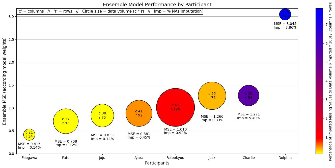 This visualization offers insights and correlates two important aspects of the 'Personal' study within the 'Influence Factors Analysis on Personal Happiness' project. On one hand, it outlines the performance of various model ensembles in predicting happiness levels for individual participants. On the other hand, it describes the characteristics of datasets for each participant, including the number of rows and columns, the data volume represented by circle size, and the percentage of imputed null values indicated by color.
